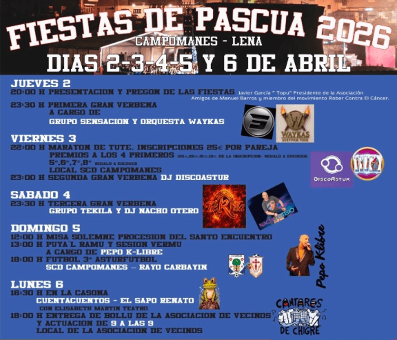 The village of Campomanes has unveiled its programme for the 2026 Easter celebrations, taking place from April 2 to 6, blending religious and community events including nightly verbenas with orchestras, a solemn mass and Resurrection Sunday procession, live musical performances, children’s games and other festive activities designed to enliven the village’s social and cultural life throughout the holiday period.